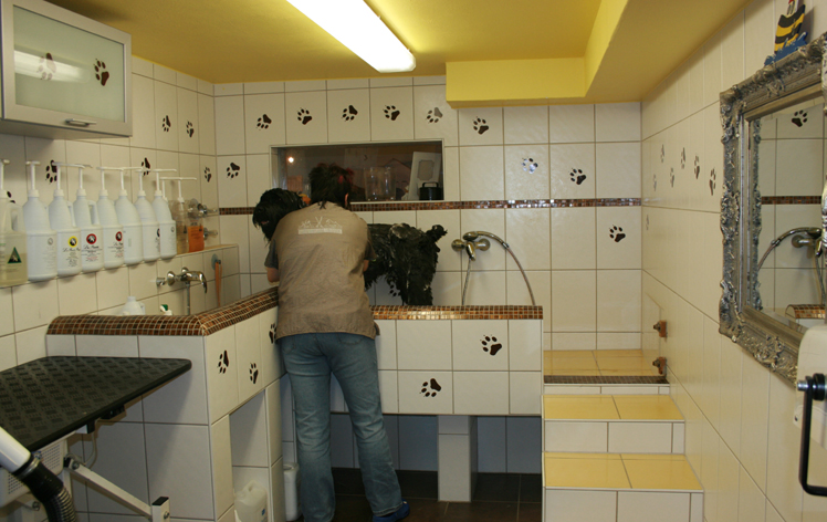 Neben dem gemütlich eingerichteten Behandlungsraum haben wir eine spezielle begehbare Badewanne eingebaut, damit auch jeder Hund jeder Größe darin Platz hat.